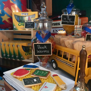 For the focal wall I featured a chalkboard backdrop which immediately gave the room a classroom ambience. Peered with my Sweet Treat Buffet Table design, it was nothing sort of magical! Woo’em Designs absolutely nailed my vision of the custom “teachers desk” table wrap design for the Sweet Treat Buffet Table! It was so whimsical yet realistic and interactive with papers flying off of it and out of the drawers! I used decorative props on the table to drive home the theme. From Mini chalkboard labels, a mini locker, teachers glasses, a fish bowl, all the way to a vintage school bell!